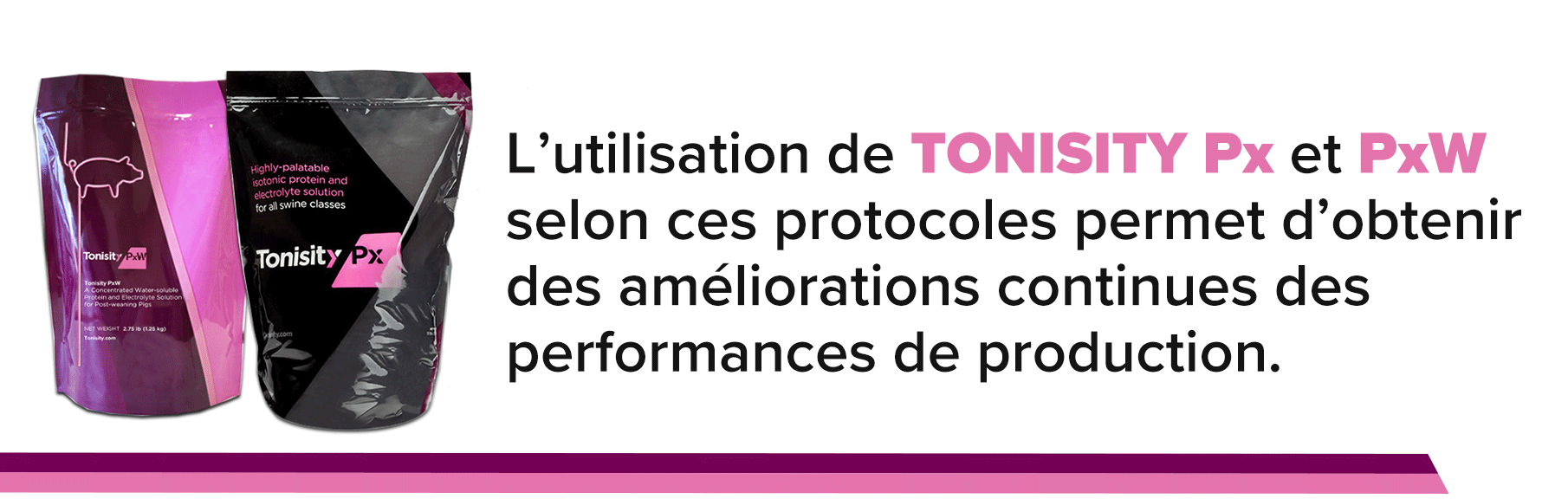 - Option 3 : Utiliser le Tonisity Px avant le sevrage pendant six jours à raison de 500 ml par portée par jour sur l’aliment. Ce protocole est recommandé pour les élevages rencontrant peu de problèmes au moment du sevrage, mais souhaitant renforcer la santé des porcelets avant le sevrage.