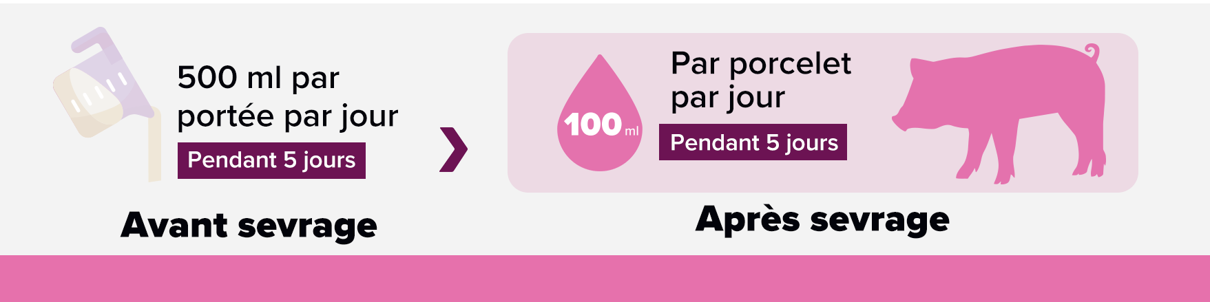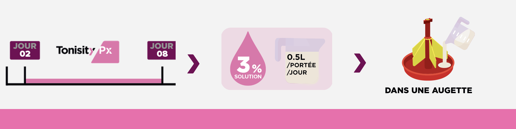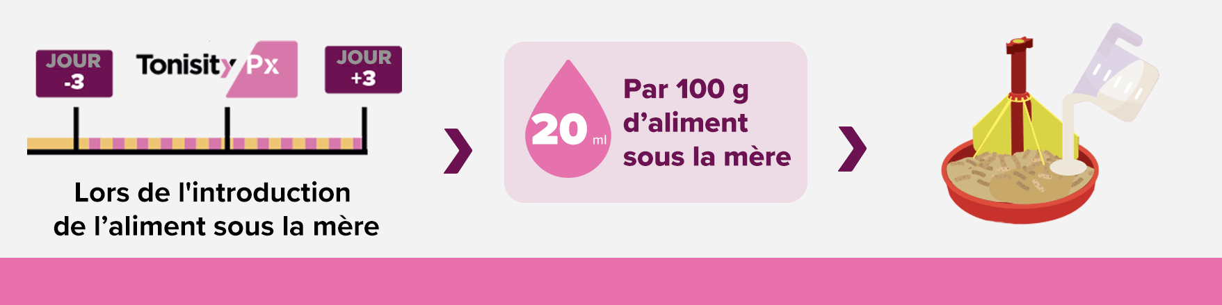 - Option 2 : Administrer le Tonisity Px avant le sevrage à raison de 500 ml par portée par jour sur l’aliment, puis poursuivre avec le Tonisity PxW dans le circuit d’eau ad libitum pendant trois jours après le sevrage. Cette option est particulièrement adaptée aux élevages équipés de systèmes de distribution d’eau, favorisant une bonne hydratation pendant le processus de sevrage.