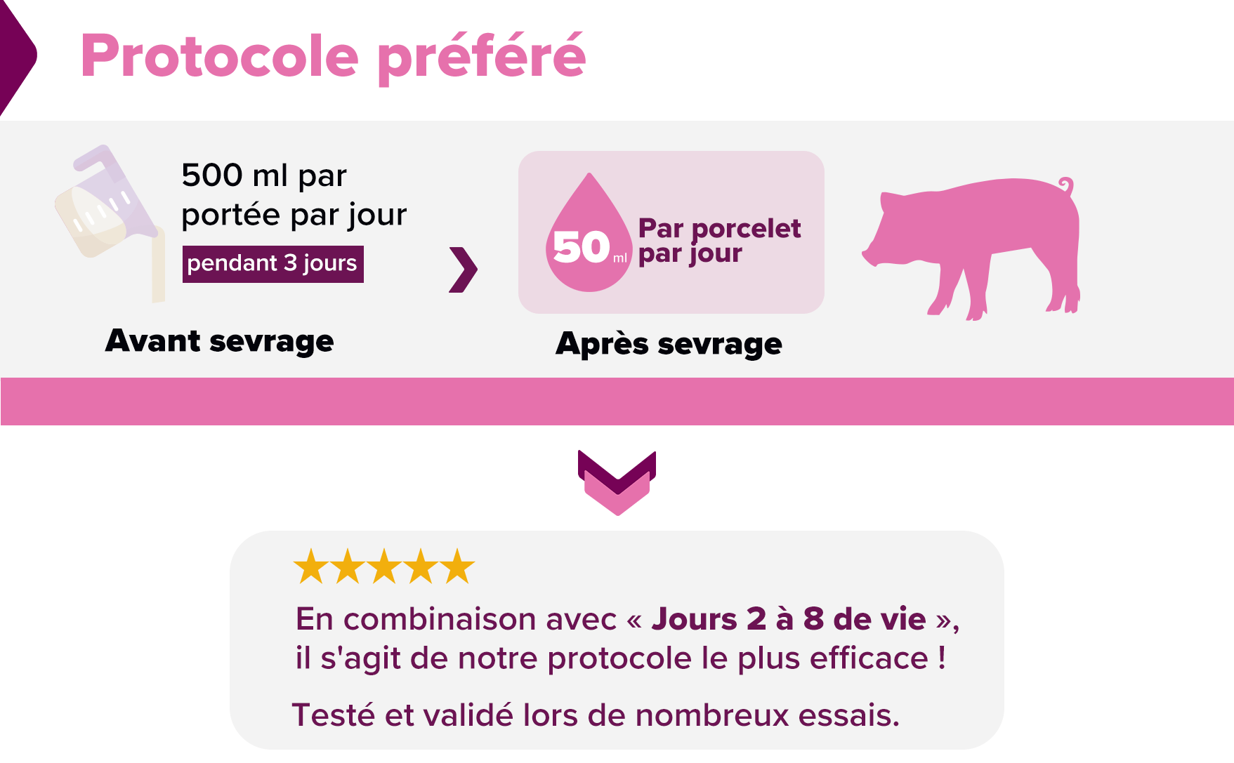 Le choix du protocole dépend des objectifs et des défis spécifiques de votre exploitation, tels que la réduction de la mortalité avant le sevrage, l’amélioration de la consommation d’aliment sous la mère et lors du sevrage, ou la gestion des porcelets plus faibles. Chaque protocole aborde un aspect particulier des soins aux porcelets, garantissant des résultats ciblés pour améliorer la croissance et la survie des porcelets.