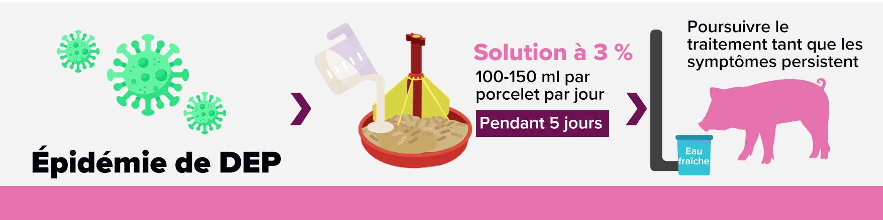Protocole : En cas d’épidémie de DEP, utilisez une solution à 3 % de Tonisity Px, avec pour objectif que chaque porc consomme entre 100 et 150 ml par jour pendant cinq jours. Poursuivez le traitement tant que les symptômes persistent, tout en assurant un accès constant à de l’eau fraîche. Il est également essentiel de mettre en place les traitements appropriés pour gérer les infections secondaires, conformément aux recommandations de votre vétérinaire. Des études ont montré que le Tonisity Px favorise une récupération plus rapide, réduit l’excrétion virale et améliore la santé intestinale globale, facilitant la réparation des tissus intestinaux lors des épidémies.
