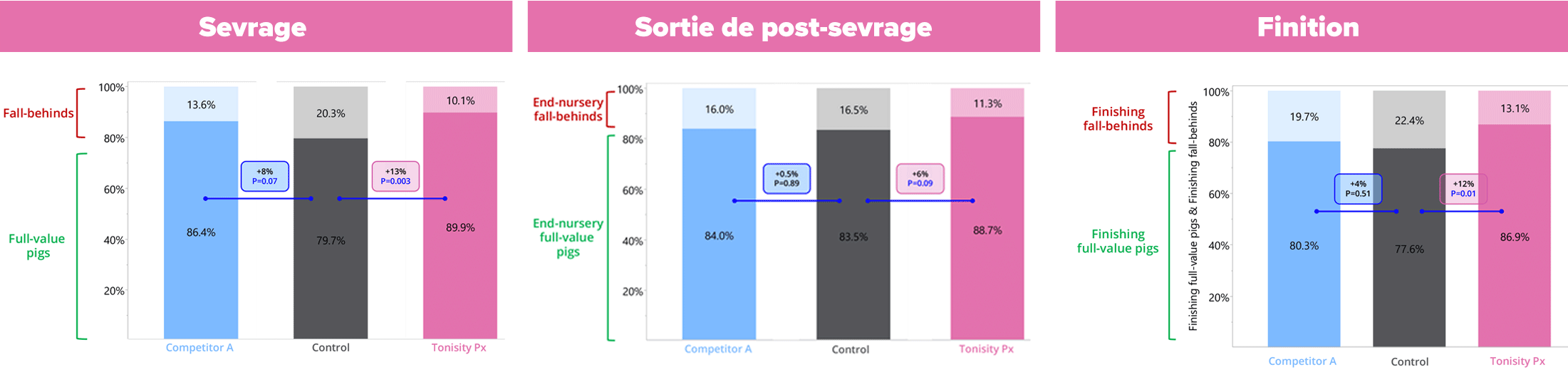 - Finition : Les porcs ayant consommé le Tonisity Px étaient plus lourds de 1,9 kg (+2%) par rapport au groupe témoin, alors que ceux du Concurrent A étaient en réalité plus légers de 0,7 kg.