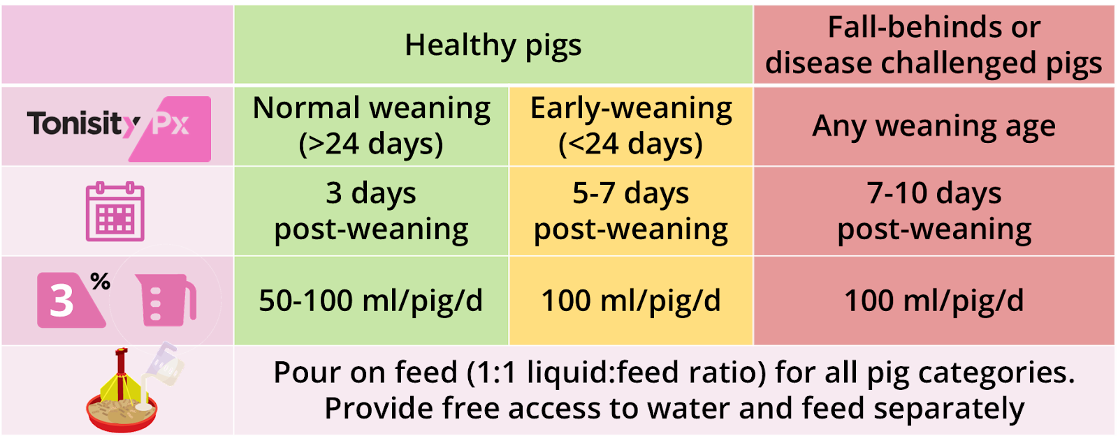 Designed to stimulate early feed exploration and intake before weaning. - Peri-weaning (3 days pre- and 3 days post-weaning; Tonisity Px 3% solution on feed):